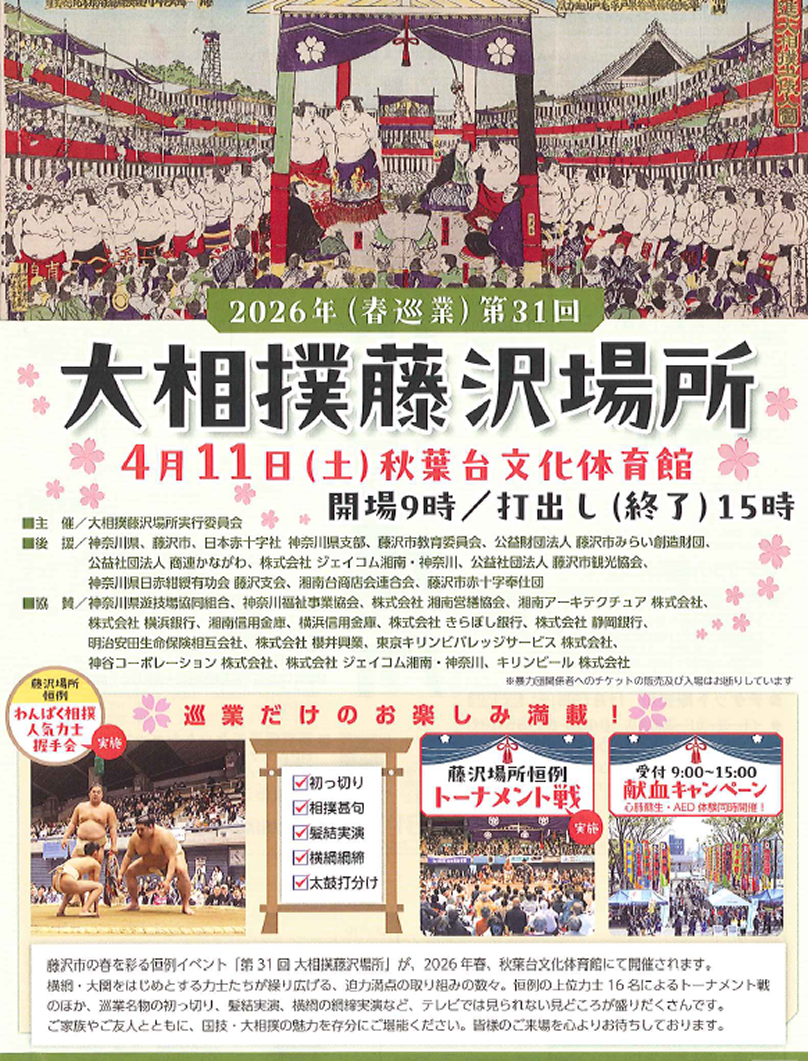 ところで、藤沢の街をクルマで走っていると横断歩道橋に「大相撲藤沢場所」の横断幕が掲出されているのを目にすることでしょう。